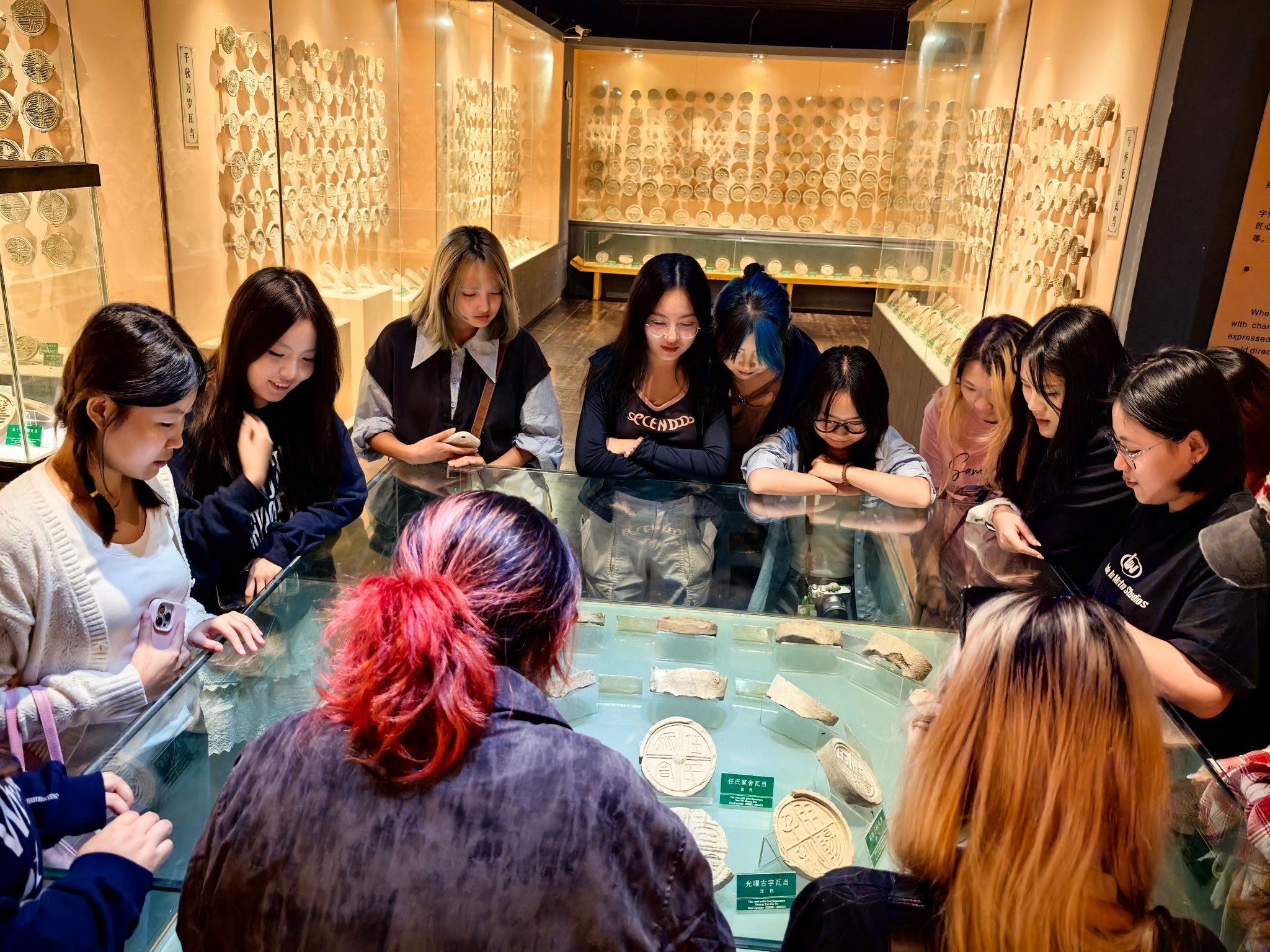 14日,在西安秦砖汉瓦博物馆,莫金龙老师通过讲解“海内皆臣,岁登成熟,道毋饥人,践此万岁”十六字砖文,让员工了解汉统治者的治国思想;通过讲解“长乐未央”“千秋万岁”“长宜子孙”“宜富昌”等瓦当的纹饰、文字寓意及文字变化,碰触古人的思想智慧,让同学们在接受审美教育的同时提高人文素养。