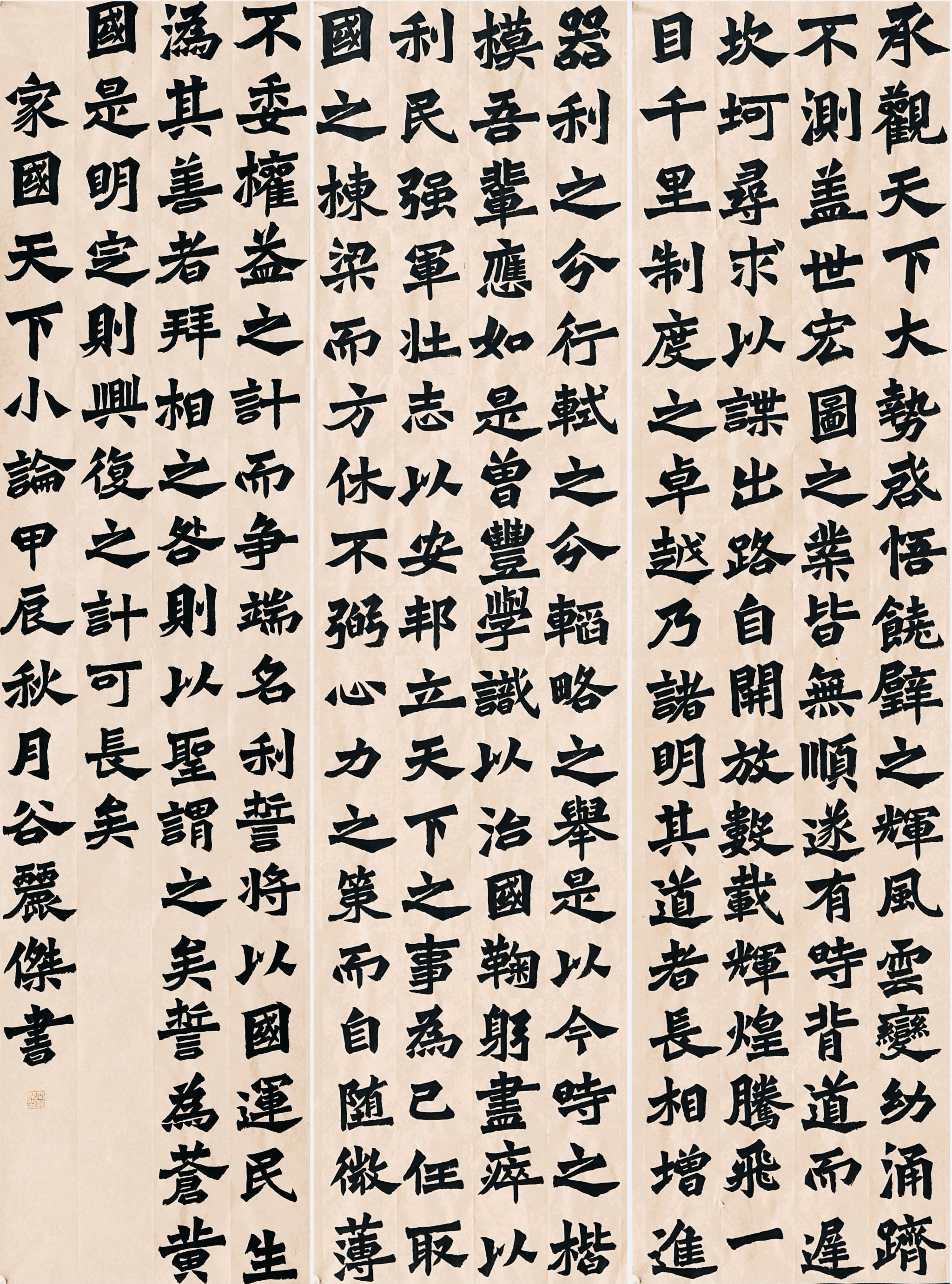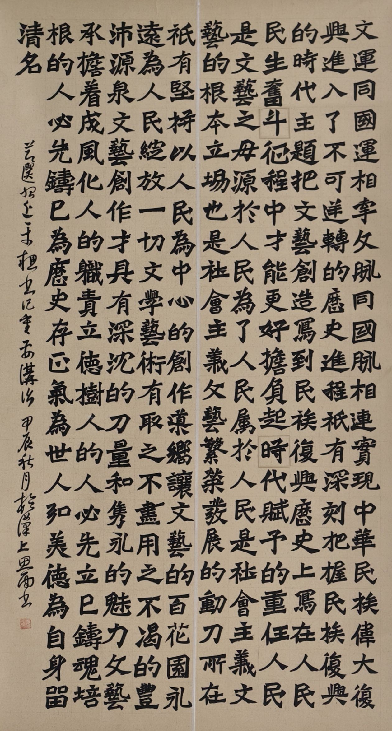 基于此次活动的思政性,员工在秋季写生作品展中创作了多幅以家国情怀为主题的书法作品。一幅幅庄重的书法作品仿若无声的呐喊,传递着深厚的爱国情怀和团结奋斗精神,更彰显出青年员工的社会责任与担当。