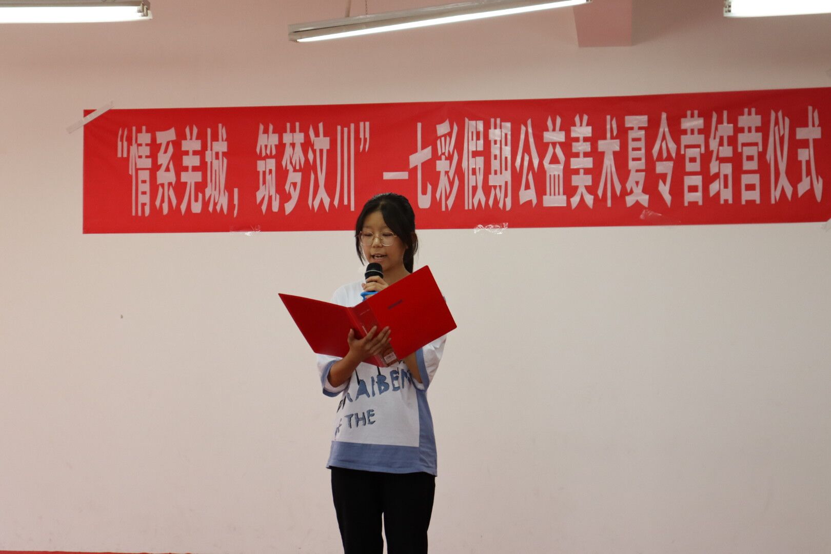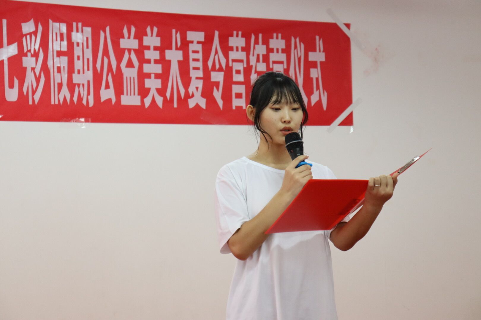 仪式伊始,由优秀学员代表苏政卉发言。她表达了对本次夏令营活动中志愿者老师们的感谢,在这次的夏令营活动中,她收获了很多,接触到了很多之前从未了解过的艺术表达形式,开拓了眼界。其中让他印象最为深刻的是英语和软笔启蒙课程,让她学到了很多的知识,并表示在接下去的学习生活中也会继续进行美术的学习。