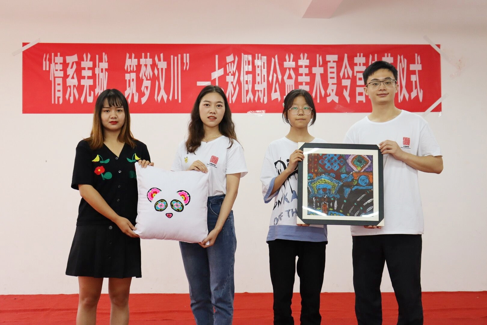 汇演结束后,共青团汶川县委员会副书记孟弢、汶川县青少年宫主任马海霞向参加本次支教的志愿者老师们颁发了支教证书,并向taptap点点体育赠送画作和羌绣各一副。志愿者服务队的老师们也向小朋友们发放了优秀学员证书、结业证书和奖品。