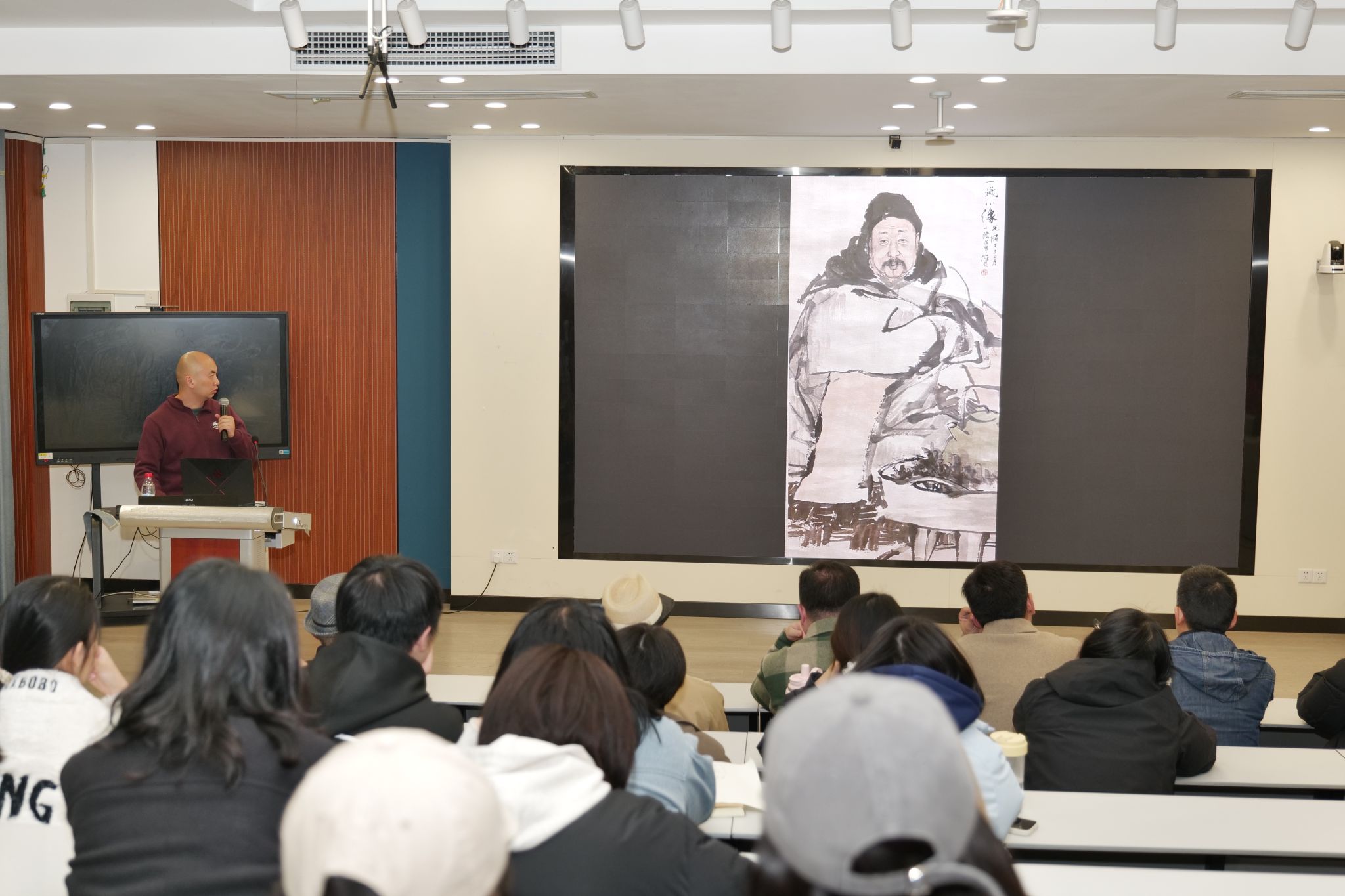 在讲座中,苏睿教授从多个方面阐述了人物画创作的重要性及其内涵。首先,他强调人物画不仅依赖于技法,更需要融入思想与精神的深度。他提到:“艺术不仅是一门技术,更是一种思想和精神的体现,这比单纯的技法更为重要。”他进一步解释,艺术创作的标准并不是单一的,而是随着个人的思想境界不断提升,艺术作品也会因此呈现不同的层次。