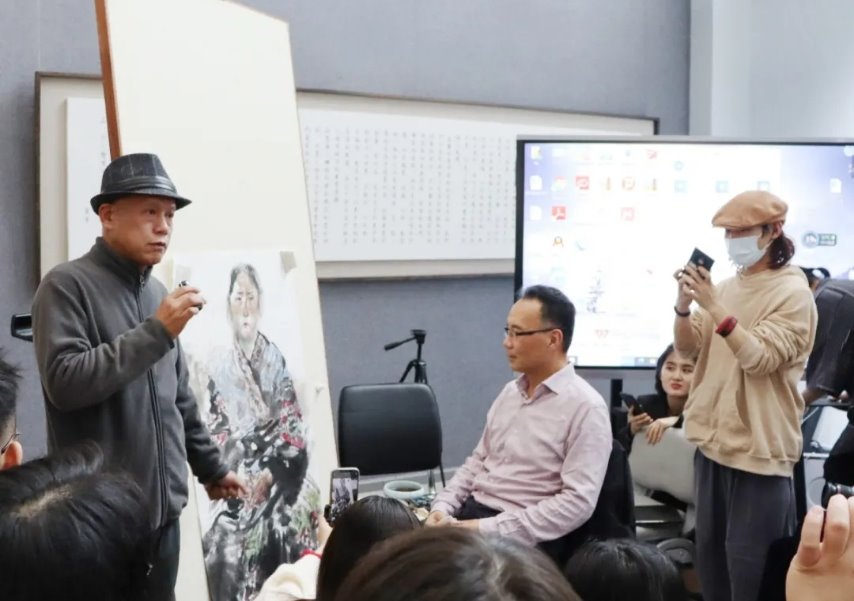 教授指出,创作者对素描要有入木三分的理解,要将其中的科学性为中国画所用。他谈到:“不依靠明暗成就体积”的造型方式,“弃暗投明,画结构、画本质、画存在”,创作者要有对事物的深刻理解,尽精微,致广大。任惠中教授提倡要养成画速写的习惯,对生活对人物的状态要记录真实感受,有及时的灵感地捕捉。他提到速写对于创作者的“反刍”作用,也就是指创作者对写生经历之积累的反复体味之后,以此滋养和赋予水墨的表达。同时,教授着重且详细描述了在藏创作的经历和丰富的生活感受,深入浅出地引领在座师生进入他的水墨世界。他将自己绘画中的一个个活生生的形象生动展现在听众面前,字里行间透露出他对生活的感悟和对艺术的热爱。
