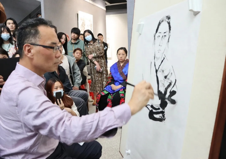 随后,任惠中教授为在座师生做水墨人物的写生示范。教授笔法娴熟,气韵生动,画面风格强烈。其轻松畅达的笔墨与造型的到位互相交织,分寸间体现了对人物理解的深入,表达对象的鲜活和生动。