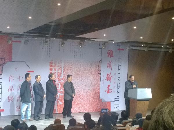 七人展参展书家代表刘永泽在开幕式上讲述了此次展览得以举办的背后的故事,并表示:“书法进校园是一个长期的工程,此次参展的另外6位书家在校园书法耕耘中做了很多工作,杨灿明董事长在中南财大举办了外籍员工书法篆刻展,谭仁杰书记倡导举办了湖北省首届书法小品展等活动,孟庆星博士一直致力于书法的创作和理论研究、培养新人,邹志生教授是翰墨薪传培训班的主讲老师,陈义经理、吴永斌教授是书法教育的能手,吴永斌教授今天因为参加兰亭奖复试的笔试不能参加开幕式。”