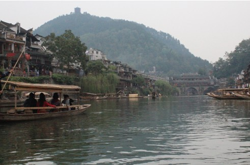 相信每个人初识凤凰,都是缘于沈从文的《边城》,我也不例外。沈老笔下的凤凰古城,绵亘逶迤于武陵山脉深处,倚山而筑,环以石墙,濒临沱江,群山环抱,河溪萦回。唯有身处其境,方能感受其韵味。至此,当然要去沈老的纪念馆参观一番,使我们对他有了更深的了解和认识。午饭后,泛舟沱江,放眼江边,探出许多参差不齐的屋檐,房底一半在江上,由错落的圆木支起,一半在陆上,垫着大块青石板,稍大一点的建着小阳台,每家每户的屋檐上都对称地吊着几串仿古的大红灯笼,这好处是要入夜后才能享受到的。转眼间,竹筏泊于万名塔边,岸边即到万寿宫,著名画家黄永玉先生的部分艺术作品也在此收藏,让我们不得不驻足观摩。随后,沿江流而下,继续行走。