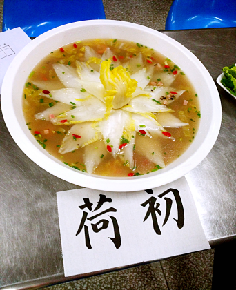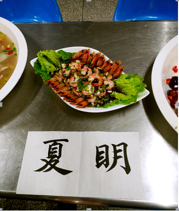 比赛开始,中国画系四名选手有条不紊的清洗准备要用的食材,分工明确,她们精心为大家准备了两道菜和一个水果拼盘,一个荤菜名为“明夏”,主料为基围虾,鲜美可口;一个素菜名为“初荷”,主料为白菜,其汤汁清香,评委老师和大众评审对两个菜品赞不绝口,三件作品不论从品相,味道,和名字都充分体现了“艺术生活”,这也是我系参加比赛的宗旨。最后,中国画系以81.5的高分取得小组赛第一名,成功晋级决赛。祝愿他们在决赛中能继续她们的艺术生活,带给大家味觉、视觉的惊艳感受。