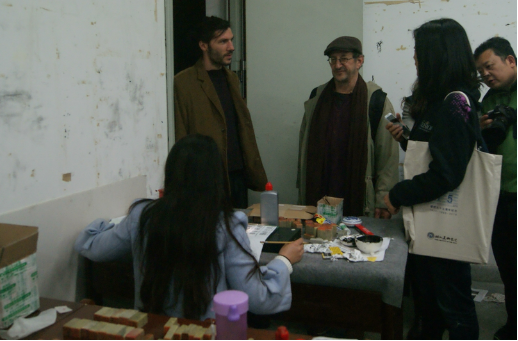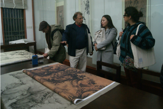 随后李峰教授带领美国艺术家们参观了国画班、书法班画室,虽然已经是傍晚6时许,还有不少员工在教室里继续专业学习。书法教室里有些员工正在刻印章,桌上摆了好些印章的石头,美国画家对此极有兴趣,向老师和同学们仔细询问。在参观研究生画室时,看到研究生正在制作颜料,中美艺术家又对作画材料互相交流了想法。