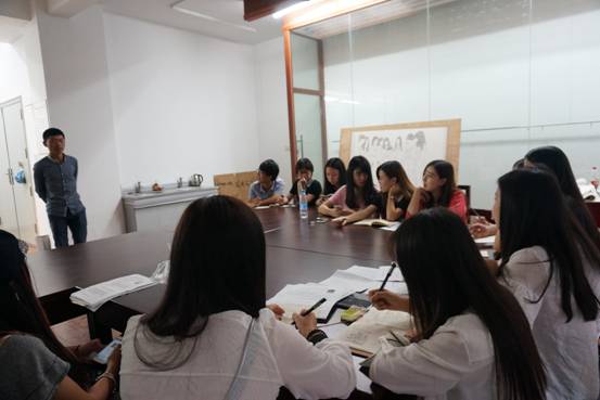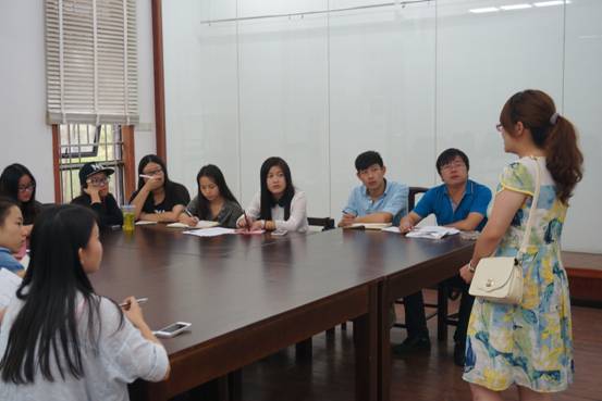 辅导员(右一)以及员工会成员正在听新生做自我介绍