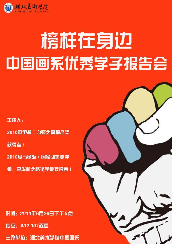 (通讯员 高晓宇)“榜样的力量是无穷的”,为充分发挥先进典型的示范作用和激励引导作用,2014年6月26日下午5时,中国画系在A12-107教室举办了优秀学子报告会。本次报告会由我系优秀员工代表尹超、马金海两位同学与大家分享学习和生活经验,传递正能量。 中国画系党总支副书记出席报告会,辅导员刘杰及在校全体本科生参加。