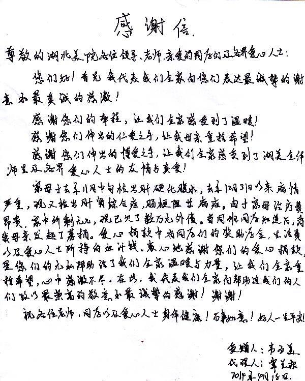 我系覃同学家庭经济条件十分困难,父母均务农为生,家中还有一个年幼的弟弟,姐弟的学费让这个家庭不堪重负。去年底,覃同学的母亲查出患有肝硬化腹水,今年初,又检查出肝肾综合征,病情危重。为了治疗母亲的病,家里欠下了数万元的医疗费,让原本不富裕的家庭雪上加霜。得知这些情况以后,中国画系志愿者分队向全系发出倡议:“献出一份爱心,成全一份勇敢的坚持,传递一份生命的热度”,发动全系同学开展爱心捐助活动。倡议发出后,大家纷纷慷慨解囊,踊跃捐款,一股股爱的暖流在校园里流淌着,大家共同唱响了一曲拯救生命、奉献爱心的赞歌。