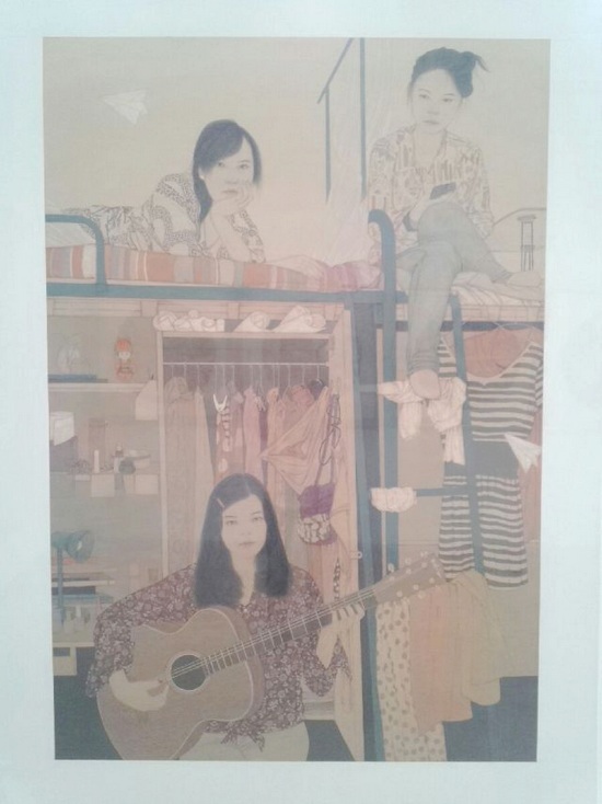 肖蓝(以下简称肖):作品质量都还是不错的,年轻人都很有自己的想法。就像这幅林清妹的作品,她的创作反映了生活实际,画出了寝室生活的场景,赋有真实感,让人又有亲切感,愿意去品它。她对色调的掌握也非常到位,她的色调能表现处年轻人的心境,也是一种梦想的体现,画面温馨,但从这幅画中还是能体现作者的迷茫。旁边这幅作品的主观性较强,支离的画面,是运用片段的表现形式,在年轻的这个年代,竞争激烈,社会复杂,压力大,透过该作品,我仍旧看到的是年轻人的迷茫与空虚。有员工采用岩彩的绘画方式,不过这种方式虽说华丽美观,具有观赏性,但没有情感的体现,那也仅仅这是装饰画,艺术更注重的是情感的表达,而不是材料的堆砌。黄卓颖用灰调衬托,用某个定格的动作神情表达某一瞬间的情感,对准确表达情感的要求做的很好。张蓉的作品中有较多的西方思想,同时融入国画元素,将人物头像放大,让画面空间变小,表现强烈压迫感。阮雪莹的《时光如飞》,从批判的反角表达对现实的不满,构图打破常规,随意却并不凌乱。