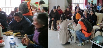 略显阴沉的日子里,往日宁静的敬老院漾满员工们的歌声和老人们的笑声。悠扬的歌声荡漾,动听的乐曲飘扬,老人们沉浸在同学们的表演中,脸颊漾满了幸福的笑容。一波又一波的掌声浸透出他们的欢乐和对同学们的欢迎。表演期间穿插的是与老年人拉家常的活动,同学们活泼天真、谈笑风生、嘘寒问暖,使老人家感受到浓浓的真情。有的同学在老人家的倾吐中感悟人生、深受启迪,表示今后要更加孝敬父母,尊重老年人,有的同学把自己对理想的追求和学习的热情带给老人,使老人家倍觉年轻。最后,“福如东海,寿比南山”、“家和万事兴”等书法作品由马金海、周斌洁两位同学现场泼墨,刚劲有力的书法作品代表着全体师生对老年人的祝愿。在依依不舍中,同学们离开了敬老院,他们表示在今后的假期中,还会自发的来到这里,看望这里的爷爷奶奶们。