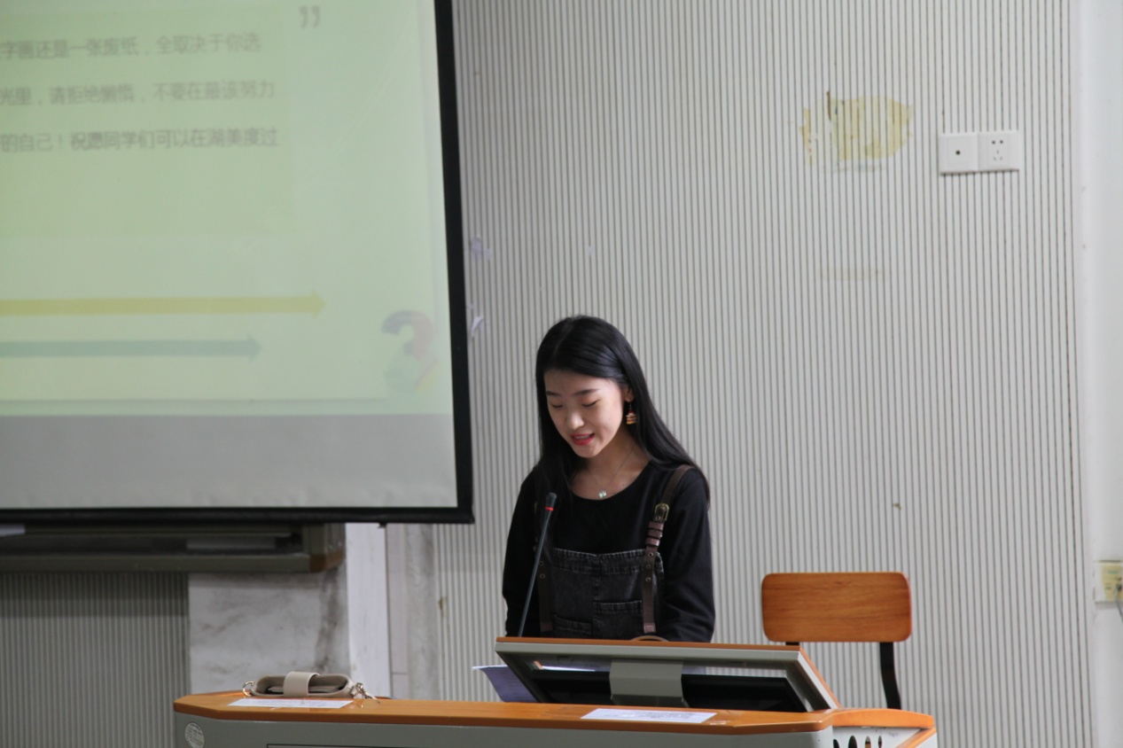 随后,曾艳老师邀请我系员工会主席张晓艺、春田志愿者队长郭日阳作为优秀员工代表发言,分享自己的老员工活、学习经验,鼓励新生在即将开始的老员工活里能够合理的规划安排自己的课余时间,让老员工活更加的丰富充实。并鼓励同学们积极加入志愿者队伍,贡献出自己的一份力量,为社会服务实现自我价值。