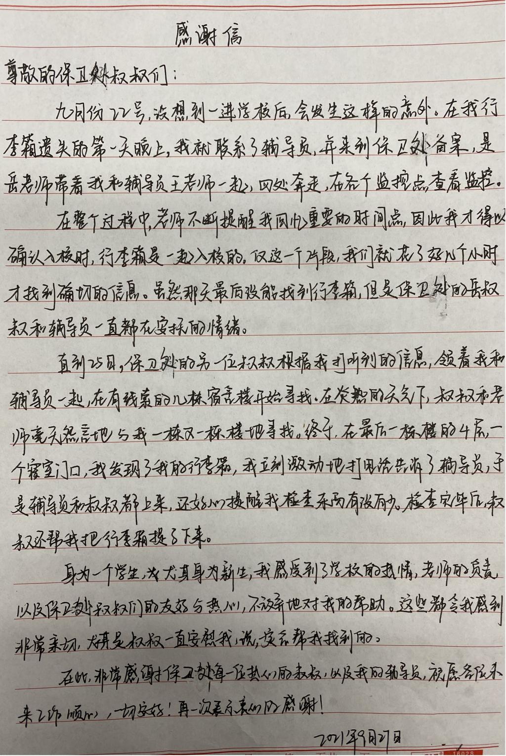 员工写给保卫处的感谢信