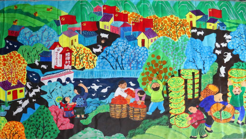 大手牵小手共同创作的巨幅长卷—乡村新风貌之腰牌村(1.7*3m)