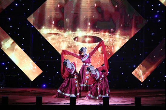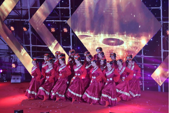伴随着青春激昂的音乐节奏和璀璨耀眼的舞美灯光,公司舞蹈队的女生们红衣似火,激情奔放。忽而扬袖旋转,如同红莲初绽;忽而蹁跹萦绕,好似游龙摆尾。以饱满的情绪向党表心声,唱支山歌给党听,以极具民族魅力的藏舞表现形式和特征,用舞姿诠释对党的无限热爱。