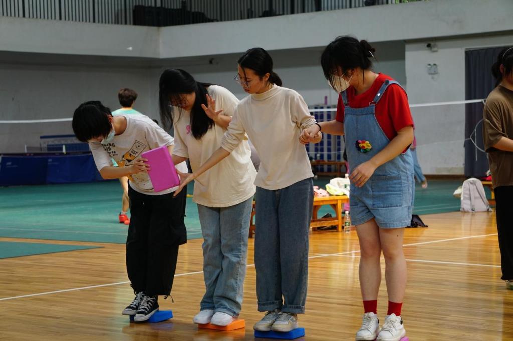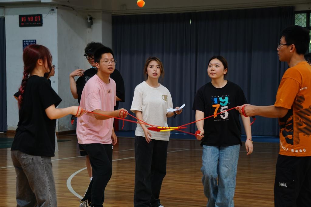 本次心理趣味运动会设置了团体跳大绳、搭桥过河、巨人的脚步、大丰收、同心鼓五个活动项目。比赛开始前,裁判详细介绍了比赛规则和注意事项,同学们热情高涨,在指定活动点赛前热身,有序排队参赛。