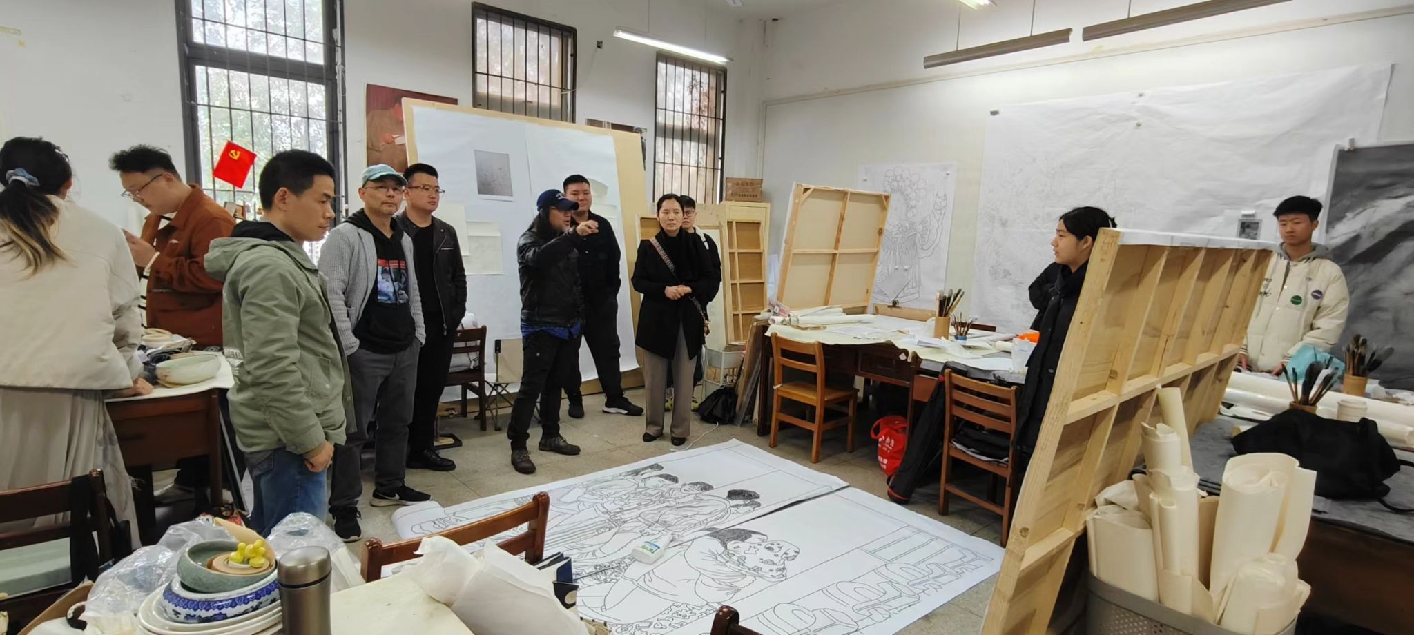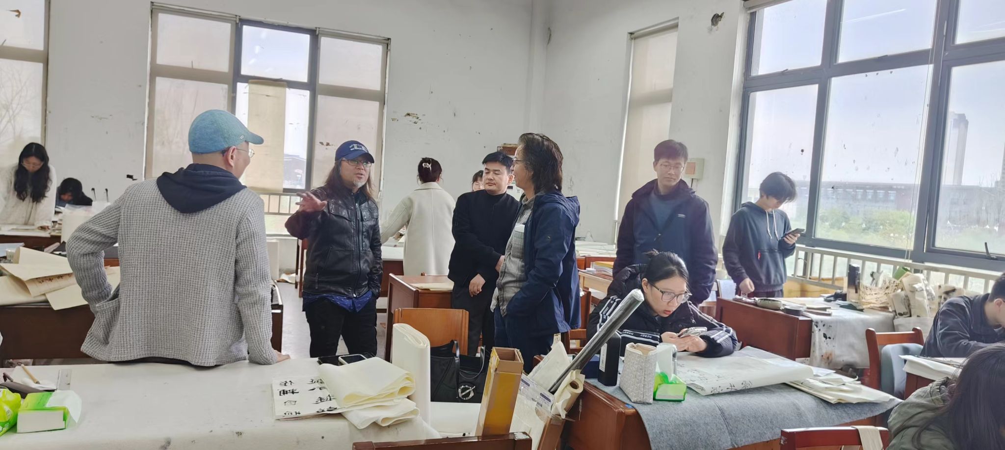 上午十点,院领导一行依次进入3个国画班和1个书法班教画室,亲自观览了员工们正在紧张有序进行的毕业创作,听取了同学们关于作品构思、技法运用等方面的汇报,对他们在作品中体现出的深厚传统底蕴和现代审美探索给予了高度评价,并针对性地提出了宝贵的建议和改进意见。强调了在创作中要厘清传承与创新并重的重要性,鼓励大家在保持传统技艺的同时,勇于突破,追求个人风格的独特表达。