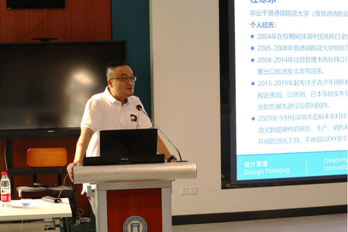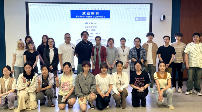杜寒冰先生首先向同学们分享了自己的读书经历和创业经历。简要阐述了一些就业方面的相关问题,并以设计思维为导向提出问题引发同学们思考。按照同学的提问和要求,从设计思维的五个步骤——同理心、定义、头脑风暴、原型制作、测试等方面向大家逐一阐述,以及如何将传统艺术现代化的创新表达,并与现场与同学们展开热烈互动,为同学们答疑解惑。易雪女士分享了原型设计部分,为大家展示如何将规划落实的实践过程,引导同学们要用跨学科融合的视角,观察思考自己的职业规划。