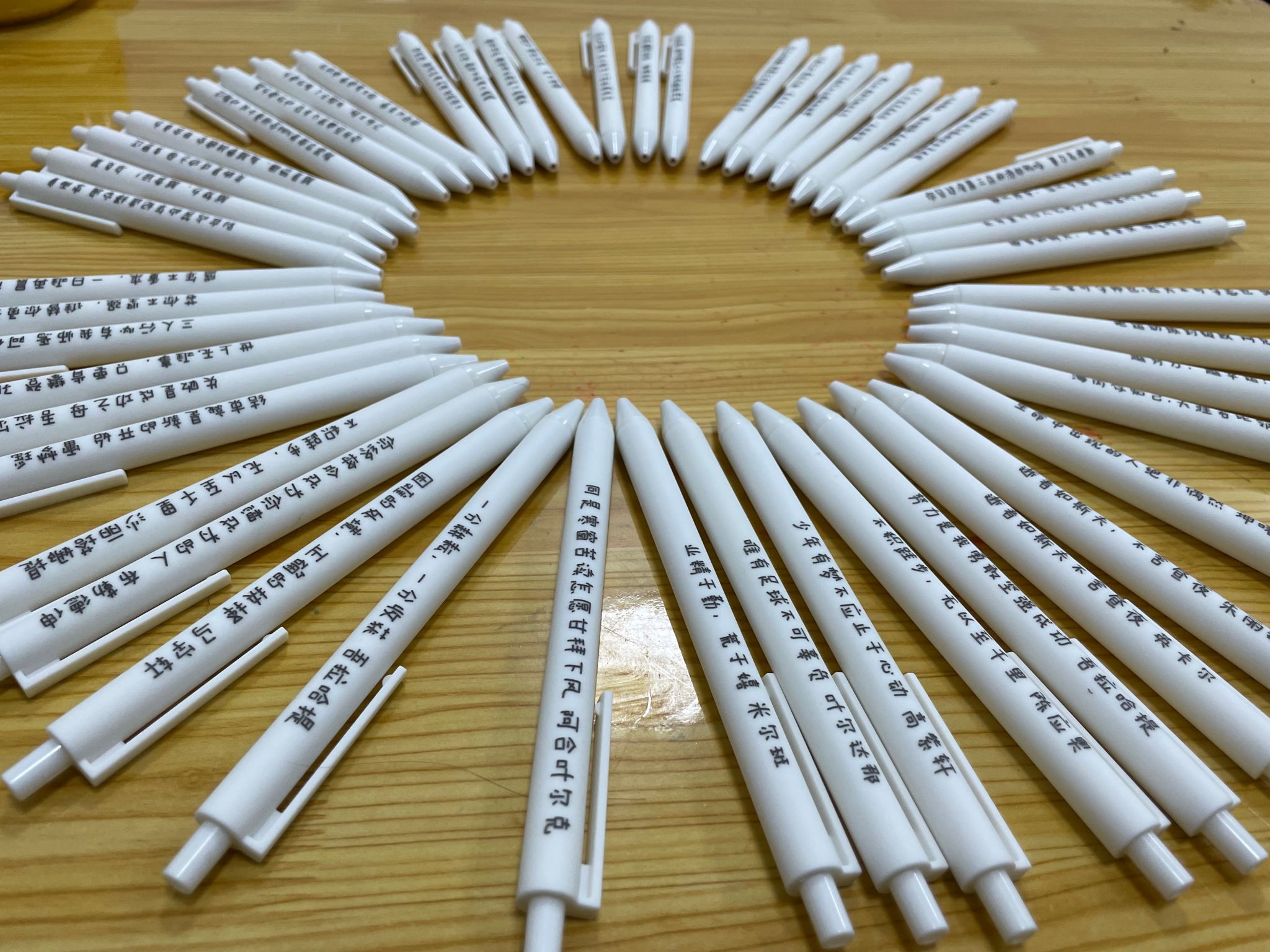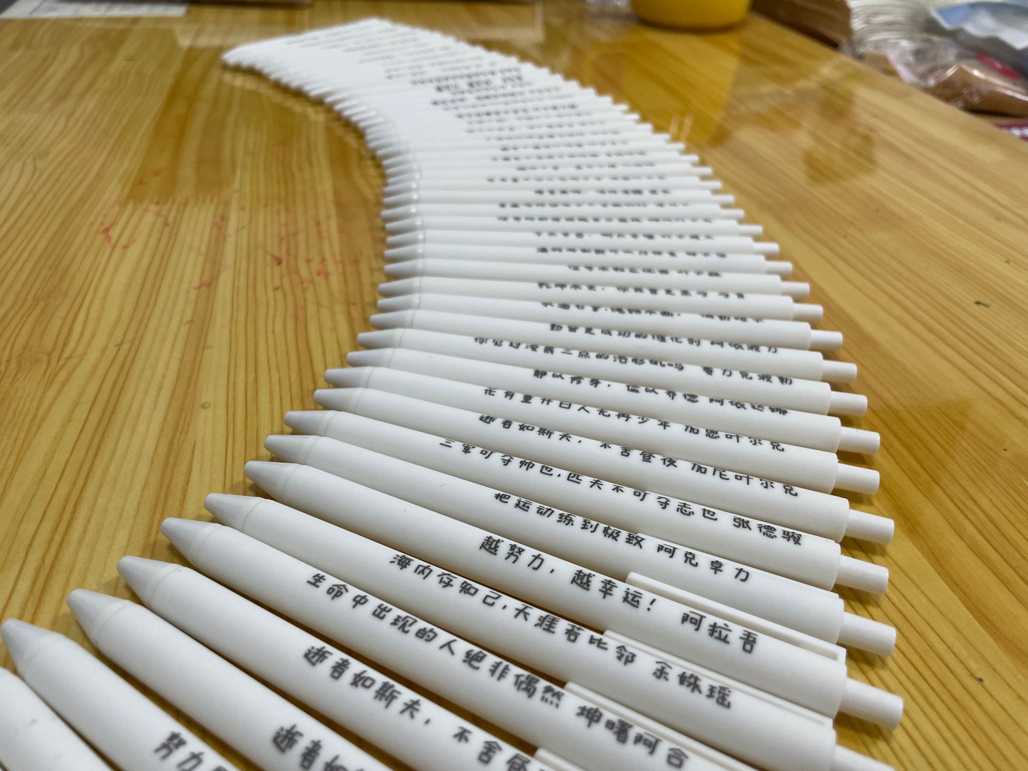 志愿服务结束前为员工们定制五十支专属座右铭圆珠笔,每位员工都爱不释手