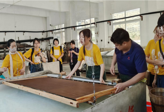关注非遗热点,撰写一份调研报告。造纸术是中国古代四大发明之一,宣纸制作是造纸术的优秀代表,是中国劳动人民长期经验的积累和智慧的结晶,宣纸具有“墨韵万变,纸寿千年”等独特性能。引导老员工撰写《关于108道手工工艺宣纸“非遗传人”梯队建设的调研报告》,为提高社会公众对宣纸优秀传统文化的认知度和工艺技能传承传播的保护意识、提升年轻一代对非遗文化的参与度和工匠精神传承弘扬的责任意识贡献青春力量。