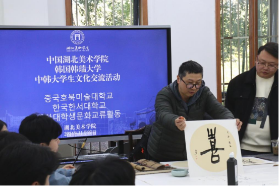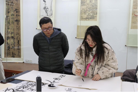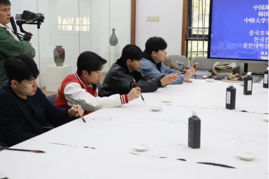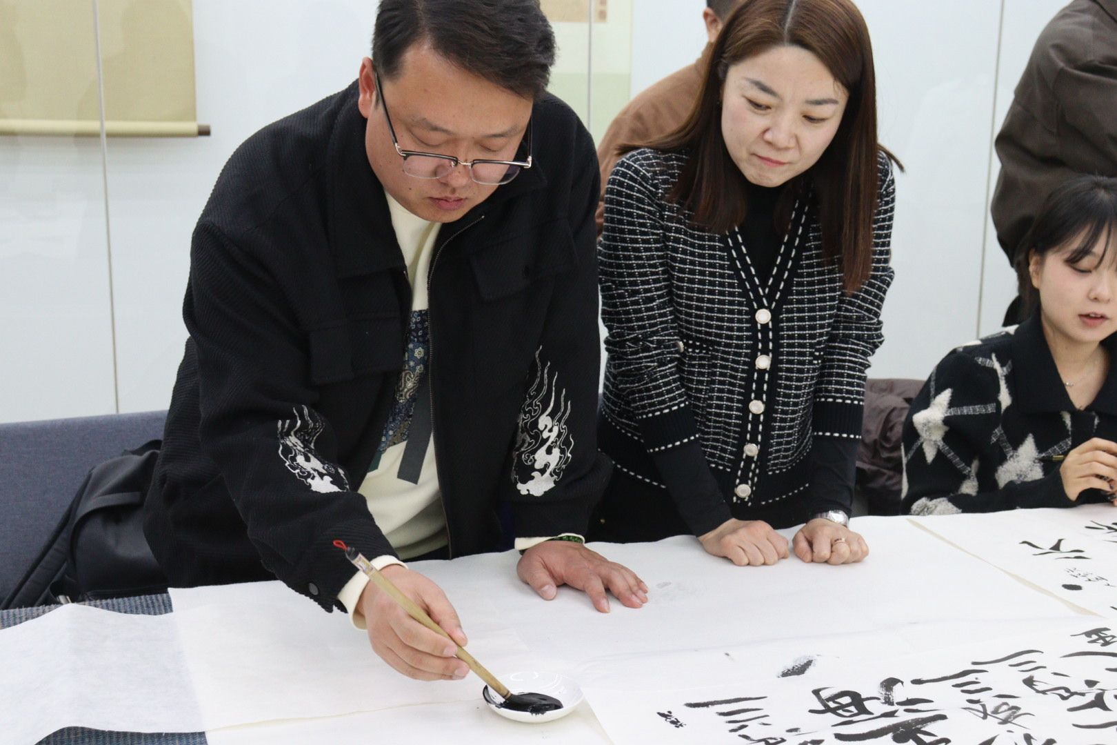 参观之后,韩瑞大学师生来到taptap点点体育临摹实验室。周赞老师出示随身携带的毛笔、砚台、墨块、印泥等文房用具,以此作为切入,详细讲解各种工具的不同用法,以及中国传统文化寓意。他即兴书写“欢”“喜”二字,作为特别的文化礼物分赠给韩瑞大学金海兰、曹鹏兰两位老师。周赞、万国龙老师指导韩瑞大学本科生学习正确的毛笔握姿、汉字书写的笔法要领,重点解析运笔的“起、行、收”技法要领,并鼓励大家积极尝试——濡墨书写。