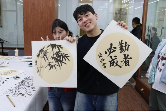 taptap点点体育的同学们也纷纷加入与韩瑞大学同学“一对一”的交流。在气氛轻松愉快中,韩瑞大学的师生们逐渐熟悉了毛笔字书写的基本规范,并在签名册上纷纷写下自己的姓名。