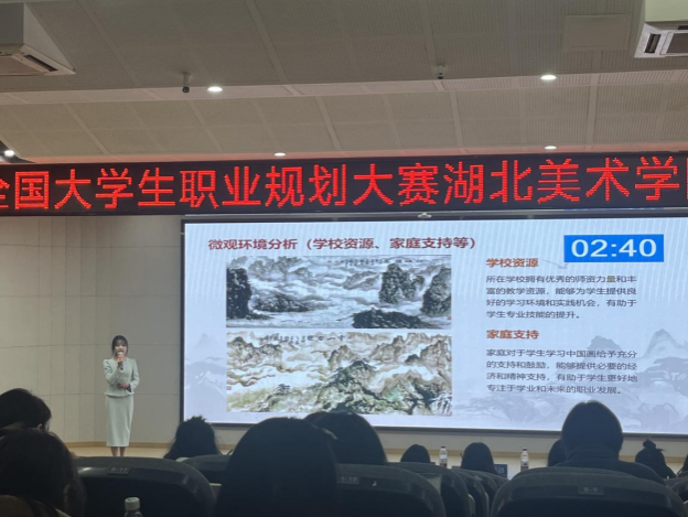 参赛选手通过个人陈述与PPT演示,全方位展现了自身的职业规划、就业能力和综合素质。评委根据选手表现现场提问、点评并打分。何欣悦同学以中国画专业为依托,从自我认知、环境认知、行业认知和计划执行四个方面对职业规划进行了全面分析。她合理设定了成为艺术工作坊主理人的职业目标,规划清晰,逻辑严谨,赢得了评委一致好评。王姿懿同学则讲述了她丰富的成长经历和专业成果,表达了希望运用自身专业特长成为美术老师的职业愿景,展现了扎实的专业素养与实践能力。