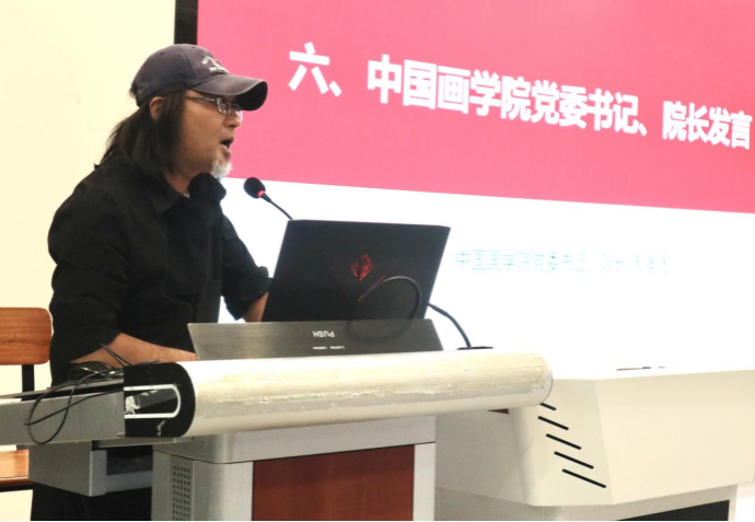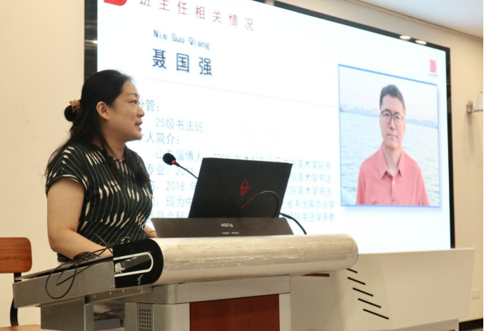 会议由办公室主任吕雯主持,她首先代表公司对参会新生和家长表示祝贺与欢迎,并通过公司宣传片引领大家沉浸式感受中国画的艺术魅力与公司底蕴。副经理熊明非分别从“百年传承”“多元共生”“地域特色”和“语言架构”四方面系统介绍公司发展,展示建校以来名师大家的创作与教学成果,阐释“一院三系五室”的组织架构与1+3人才培养模式,介绍“双一流”建设背景下学科发展与课程建设成效。书法篆刻教研室主任莫金龙详细介绍了书法专业的历史沿革、团队队伍及团队建设成果,并展示专业教师孟庆星、刘天琪等人的作品。