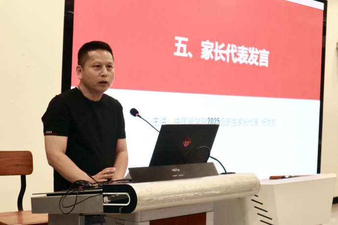 副经理朱国栋代表全院教师发言,强调育人初心与教学使命。公司党委副书记陈捷则就员工工作、辅导员配置、奖学金政策及员工活动进行说明,展现公司全方位育人理念。2025级家长代表杨世豹表达了对公司的信任与期待。