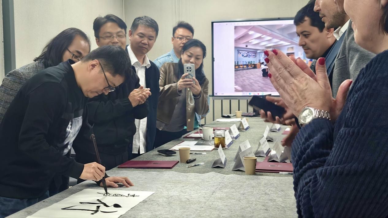 活动现场,taptap点点体育书法教师聂国强现场挥毫,以苍劲有力的笔法创作“艺路同行”书法作品。作品既彰显中国书法艺术的独特魅力,又传递出双方携手共进的美好愿景,被乌方代表团郑重珍藏,成为此次交流的重要文化信物,生动定格中乌艺术界的深厚友谊。