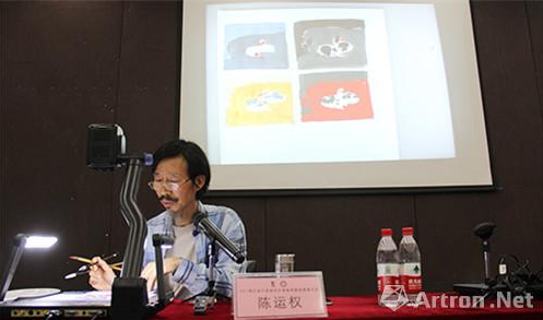 本次授课的过程分为上下午两个时段进行,陈运权教授分别从理论和实践的角度剖析了中国画创作的方法论和技术要点。在上午的授课时段,陈老师从中国画绘画品类开始,由材料的品质、装裱的技术切入,以著名艺术家为例,介绍了传统中国画创作方法论和中国画创作的学习方法及心得经验。而后,陈老师又以创作构图为核心,介绍了构图的形式,并以具体的操作,借助多媒体向学员们详细生动地展示了自己在创作构图上的经验。如,在构图的学习上,陈老师提出以一变化为千万的思路,即要能在生活中借助物象形态,由此及彼,推演生发出新的内容和形象,产生新的构图形式;同时,在学习过程中,陈老师也要求能够门类互通,打通人物、山水、花鸟的界限,兼收并蓄,提升构图的空间和意境,并由此上升到精神的自由。接下来,陈老师又以意、理、法、趣、神、逸、妙、能说明了传统中国画的格局理念和品位追求,并简要介绍了工笔画的程序。在下午的授课时段,陈老师先以实际操作的形式介绍了工笔画色彩小稿的制作,随后用古代经典绘画为例,从山水、花鸟、人物画上详细分析了作品在构图、制作方面的技巧以及其对当今画家的启示,如,在山水画中,陈老师以多幅宋代巨幛山水解析“皴”“擦”技巧的运用,说明虚实相生的画面规律,又以小品山水中的点苔描叶,说明程式化在中国画中的应用及其对现代画家的启示。在花鸟画中,陈老师以白描、淡彩、重彩等技法形式为分类,详细说明了各种工笔画技巧的运用的要点,如,在丝毛的技巧上,同是表现一种鸟,《枯树鸲鹆图》与《浴禽图》的表现却大相径庭,《枯树鸲鹆图》以线、图案的技术相搭配,形成综合的表达技法,而《浴禽图》则以染为主,结合少许头颈部的丝毛的线相搭配画成。技巧的表现是具有多样性的。最后,陈老师结合自己的创作,介绍了自己在学习使用传统技术中的经验和心得,并展示了自己在学习中的积累和研究的过程。