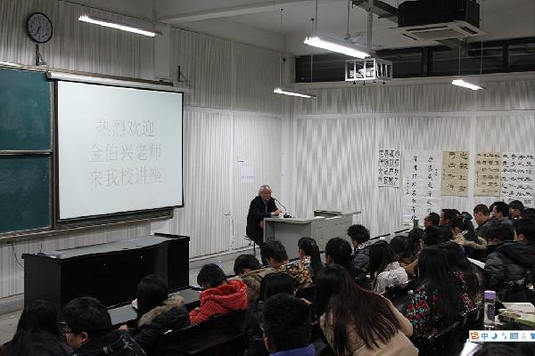 (通讯员 许立群)11月27日晚,著名书法家金伯兴先生应邀来到公司,在A12-205教室为中国画系师生带来了一场以“书法欣赏”为主题的艺术讲座。讲座由中国画系书法教研室主任孟庆星副教授主持。中国画系书法专业教师、研究生以及本科生一同聆听讲座。