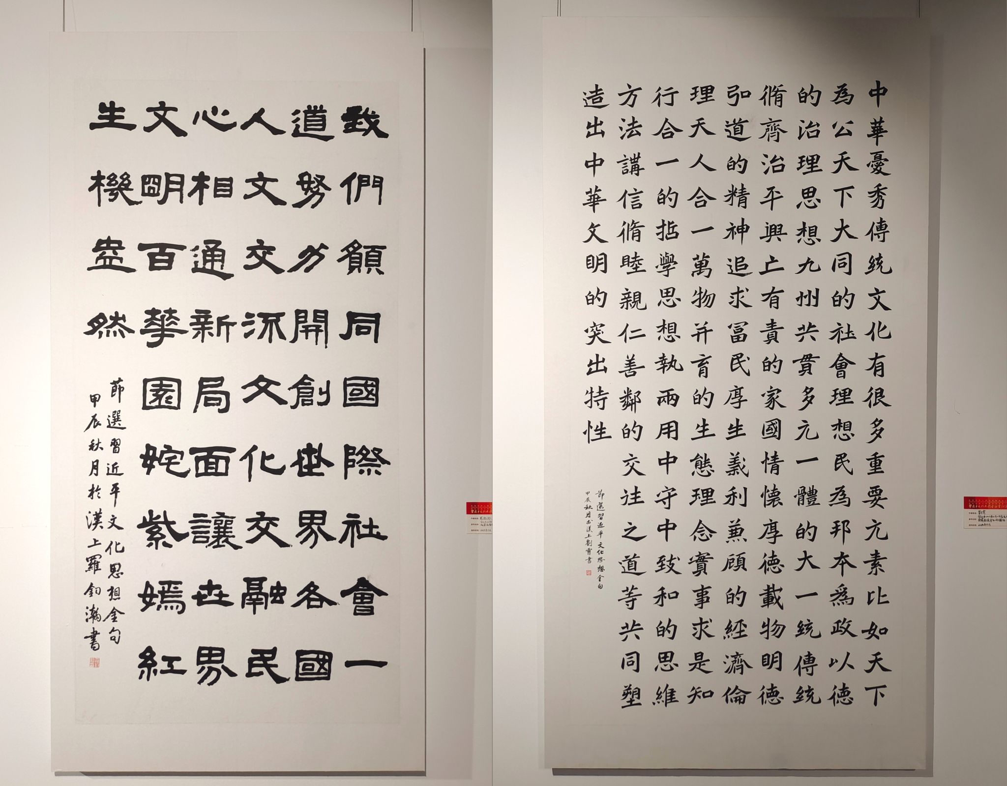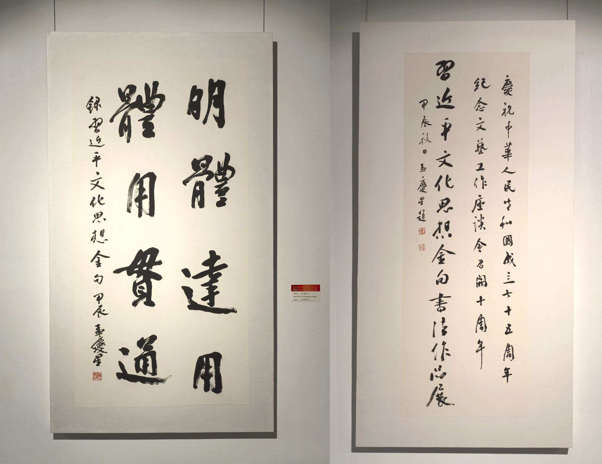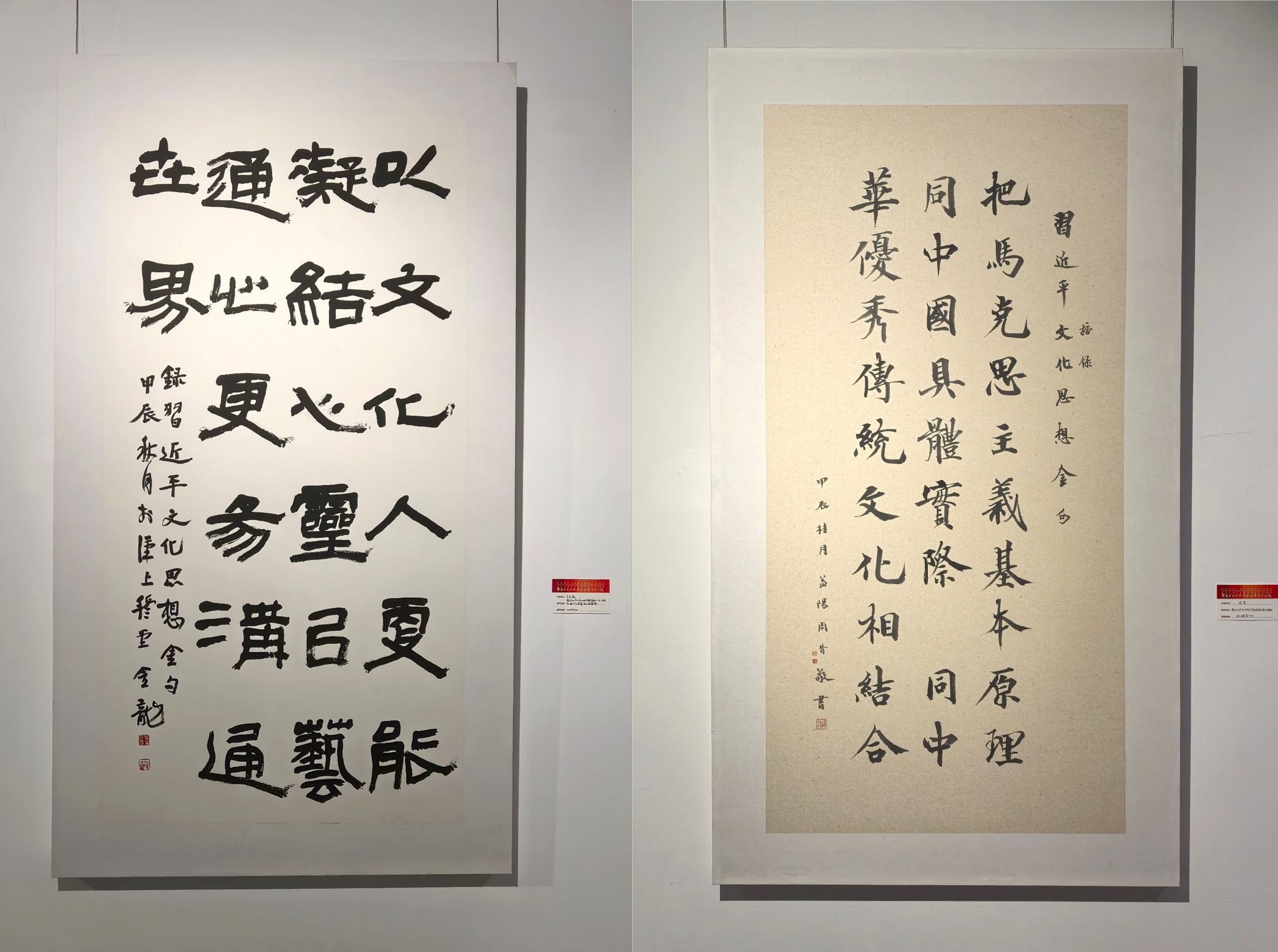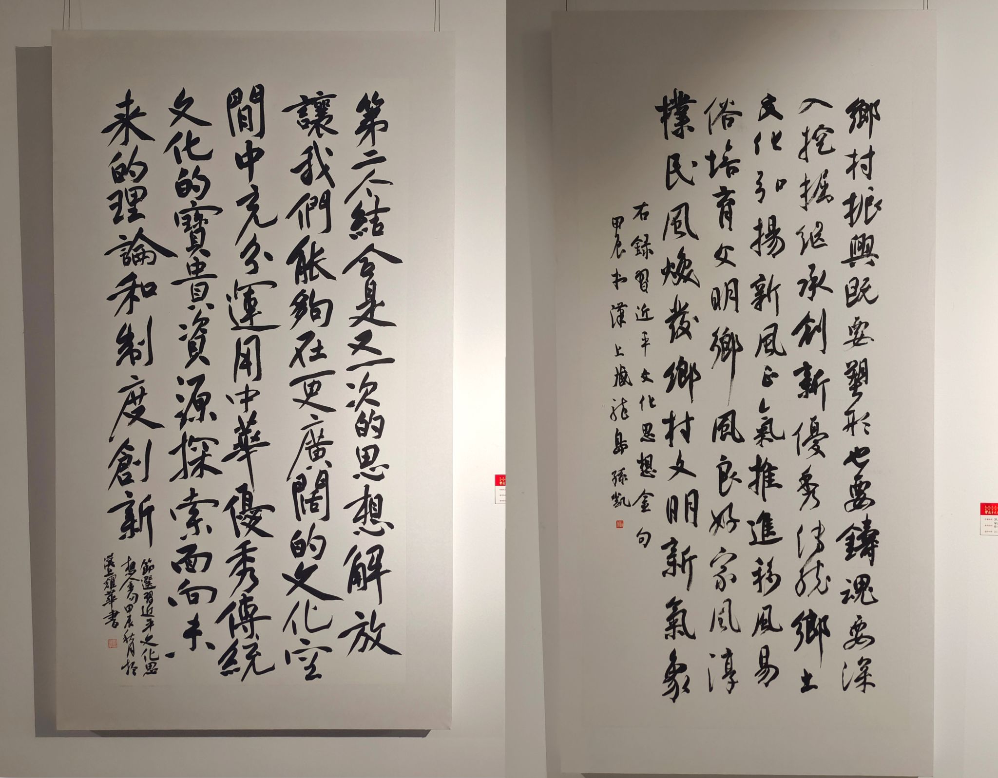 本次展览共展出63件书法作品,形式多样,涵盖篆、隶、草、行、楷五种书体;内涵丰富,系统展现了十八大以来,习近平文化思想形成的重要论述、重要讲话、重要指示批示等经典金句,令作者和观者在创作欣赏书法艺术独特魅力的同时,也潜移默化感悟到习近平文化思想的博大精深。不仅为员工搭建了“丹青铸魂”课程思政的育人平台,也为推进党建与教育高质量发展“一融双高”提供了重要路径,更为实现中华民族伟大复兴的中国梦积聚和奉献精神力量。