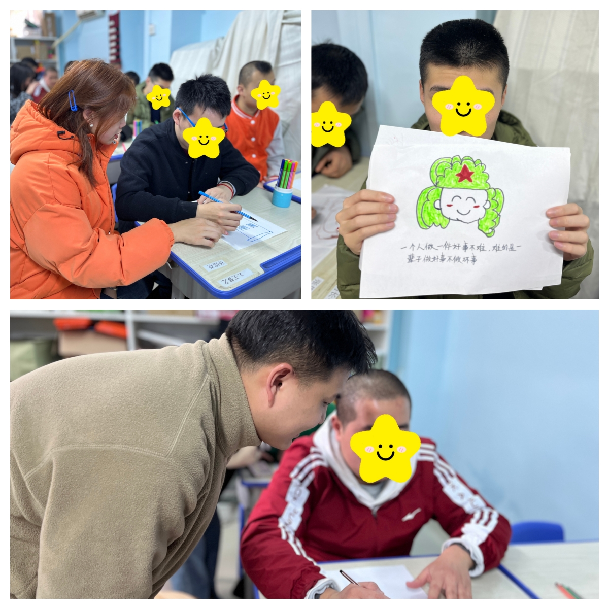 “一个人做点好事并不难,难的是一辈子做好事。”春田志愿者分队从2014年组建以来,历时9年一直坚持“守望星园”,用艺术的形式给“星孩”种下美的种子、传递爱的能量,用真诚去温暖“星孩”的心。先后为“星孩”设计了“小朋友画廊”“手提袋制作”“树叶拼贴画”“彩绘福字”“动漫角色”“粘土捏制动植物”“卡通雷锋”等挖掘艺术潜能的活动;陪伴“星孩”学习“打扫卫生、择菜、包装食品、售卖点心”等训练协调能力、自食其力的手工劳动;变着花样与“星孩”们一起玩“萝卜蹲”“击鼓传花”“钻呼拉圈”“传递篮球”等趣味游戏;欣赏“星孩”的唱歌、舞蹈表演及钢琴弹奏等才艺展示等。倾心融入“星孩”的世界,理解并接纳分享他们的纯真与快乐,让“星孩”不再孤独。