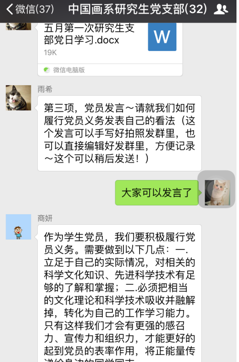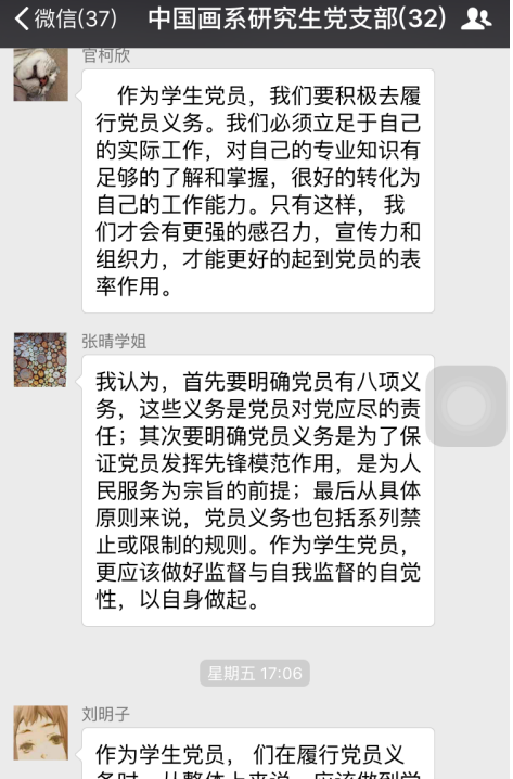 会议的开始,重温入党誓词:我志愿加入中国共产党,拥护党的纲领,遵守党的章程,履行党的义务,执行党的决定,严守党的纪律,保守党的秘密,对党忠诚,积极工作,为共产主义奋斗终身,随时准备为党和人民牺牲一切,永不叛党。接着,陈雨希同志带领大家共同学习《关于党员干部大办婚丧喜庆事宜监督检查办法》、《关于新形势下党内政治生活的若干准则》、《中国共产党党内监督条例》。我接下来,大家围绕学习的内容发言讨论。 商妍说:“作为员工党员,我们要积极履行党员义务。需要做到以下几点:一.立足于自己的实际情况,对相关的科学文化知识、先进科学技术有足够的了解和掌握;二.必须把相当的文化理论和科学技术吸收并融解掉,转化为自己的工作学习能力。只有这样我们才会有更强的感召力、宣传力和组织力,才能更好的起到党员的表率作用。党员田知灵说:“ 作为一名员工党员,在履行党员义务上我觉得应该做到三个方面,第一要做到知识全面。我们应该在每次学习中,不断地丰富自己的理论知识;第二是严格自律,以身作则;第三是要有高度的行动自觉。各位研究生党员都充分表达了自己学习的体会。