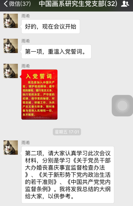 (通讯员:耿春雨)按照工作安排,5月12日, 中国画系研究生党支部组织学习《关于新形势下党内政治生活的若干准则》、《中国共产党党内监督条例》。学习由支部副书记陈雨希同志主持。