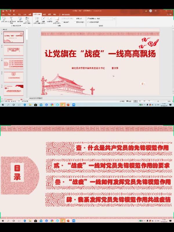 其次,中国画系党总支书记曹汉萍围绕《让党旗在战疫一线高高飘扬》讲授了七一专题党课。共产党员的先锋模范作用是让党旗在战疫一线高高飘扬的重要因素。曹书记围绕什么是共产党员的先锋模范作用、战“疫”一线对党员先锋模范作用的要求、战“疫”一线如何发挥共产党员的先锋模范作用以及我系发挥党员先锋模范作用共战疫情的情况进行了细致、深入的解读。我系教师、员工执笔抗疫、志愿服务、爱心捐款、义卖捐赠等行动,为战胜疫情贡献出了力量。希望我系教师、员工在以后的工作、生活中继续发挥党员的先锋模范作用,为实现中华民族伟大复兴的中国梦而不懈奋斗。