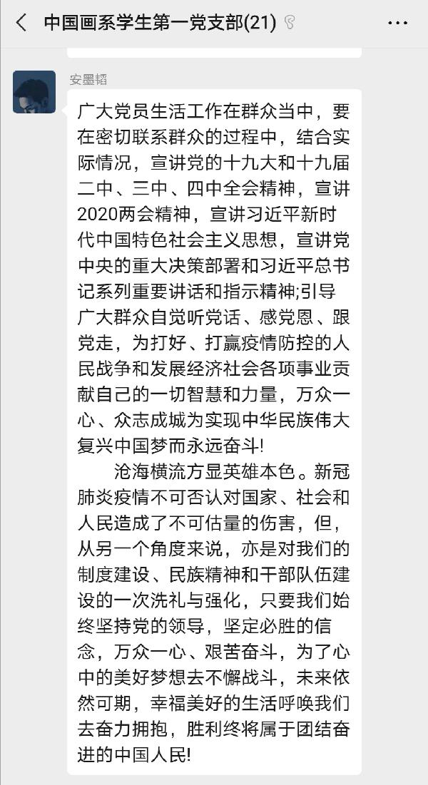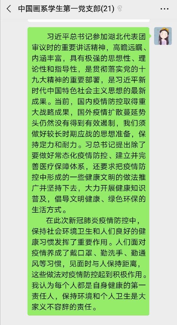 (通讯员:张晓艺)为学习贯彻十三届全国人大三次会议精神,密切联系实际,中国画系员工第一党支部开展6月线上支部主题党日活动,通过线上视频会议及时跟进学习习近平总书记最新重要讲话文章,全体本科生党员参加了此次活动。