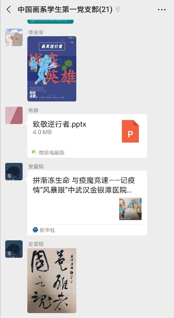 以“迎党的生日、讲战疫故事、悟初心使命”为主要内容,党员同志用不同形式分享自己心中的战疫精神,形成了独具党支部特色的“战疫故事汇”。在这场全民皆战的战疫中,是广大医务工作者舍生忘死,冲锋陷阵在疫情最前线,是广大服务志愿者的无私奉献,使疫情得到控制,他们用大爱铸就担当。岁月静好,是因为有人在为我们负重前行。