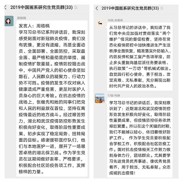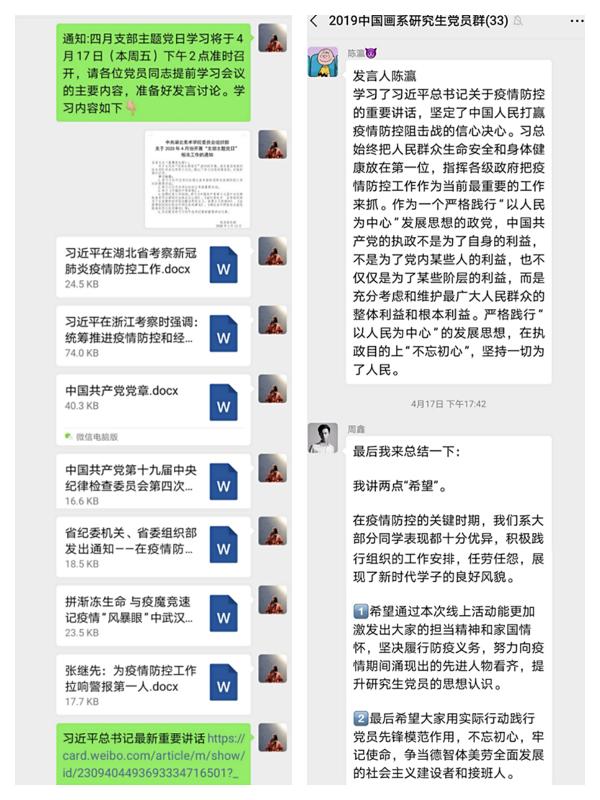 为了坚决贯彻习近平总书记在疫情防控工作上的重要指示精神,进一步学习如何加强党员的先锋模范作用,按照公司党委组织部及我系党总支的相关部署,中国画系员工第二党支部于4月17日下午组织开展了本月的线上主题党日活动,全体研究生党员参与了此次活动。