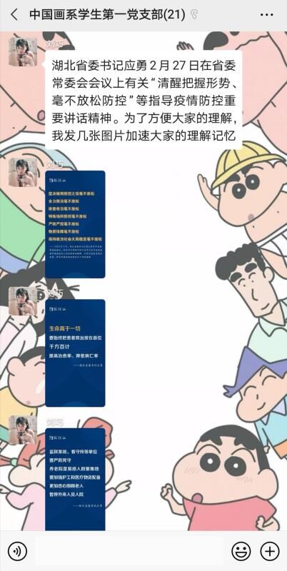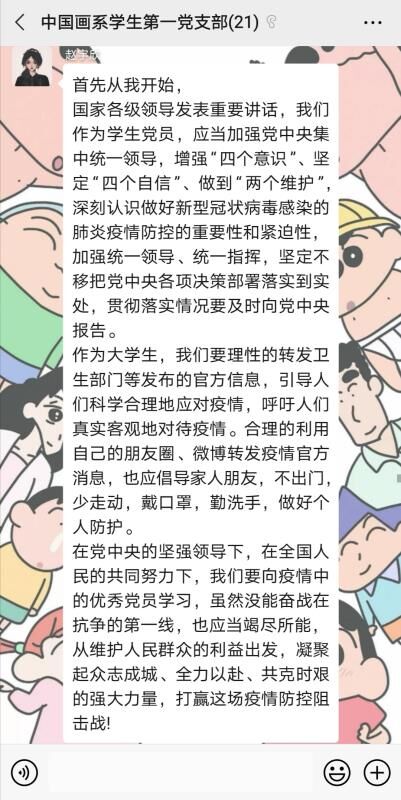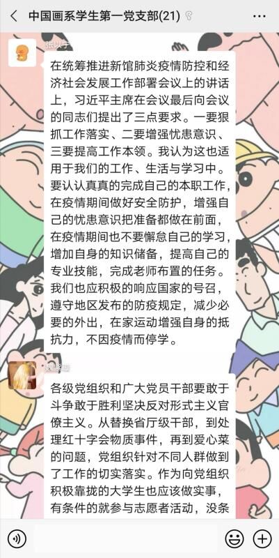 中国画系员工第一党支部开展线上支部主题党日活动由组织委员赵宇欣同志主持会议。首先,刘巧同志带领大家学习“习近平总书记在中央政治局常务委员会会议研究应对新型冠状病毒肺炎疫情工作时的讲话,在统筹推进新冠肺炎疫情防控和经济社会发展工作部署会议上的讲话”、湖北省委书记应勇2月27日在省委常委会会议上有关《清醒把握形式、毫不放松防控指导疫情防控重要讲话精神》、《习近平总书记在十九届中央纪委四次全会上的重要讲话精神》、《中共湖北省第十一届纪律检查委员会四次全会精神》及《中共湖北省委 湖北省人民政府 关于全力以赴坚决打赢我省新冠肺炎疫情防控阻击战的意见》。通过学习文件,各位党员在充分领会文件精神的前提下,纷纷发表自己的见解与感悟。其中,张以宁同志认为应积极响应国家号召,坚定信心、同舟共济、科学防治、精准施策,并遵守地区发布的防疫规定,积极抗疫。