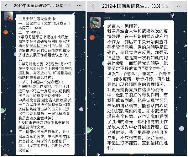 (通讯员:叶蕾)为了坚决贯彻习近平总书记重要指示精神,进一步发挥党支部战斗堡垒作用和党员先锋模范作用,按照公司党委组织部及我系党总支的相关部署,中国画系员工第二党支部于3月12日下午组织开展了本月的线上主题党日活动,全体研究生党员参与了此次活动。