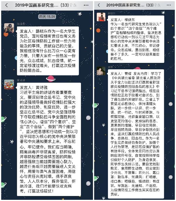 随后,与会研究生党员就以上内容展开讨论,交流学习的体会与感悟。其中杨春颖同志谈到习近平总书记的重要讲话和一系列重要指示深刻阐述了疫情防控的重大意义、基本策略和重点举措。作为践行“两个维护”的第一方阵,作为员工党员的我们,要以身作则,起先锋模范作用,增强“四个意识”、坚定“四个自信”、做到“两个维护”,坚决把思想和行动统一到以习近平同志为核心的党中央决策部署和中央通知要求上来,坚持把疫情防控工作作为重大的政治任务、当前最重要的工作,不畏艰险、挺身而出、英勇奋斗、扎实工作,团结带领各族群众,众志成城、万众一心打赢疫情防控阻击战。何梦林同志则表示学习了习总书记重用讲话精神,作为一名中国共产党员要做好防疫工作。坚信在总书记、党中央领导下会取得疫情防控斗争全面胜利。深刻体会到总书记为全面战胜疫情凝聚起强大力量,心系群众利益。深刻认识到防控工作正处于最吃劲的关键阶段,需保持定力,咬紧牙关打赢这场硬仗。同时,在疫情没结束之前坚决不返校,不给公司制造麻烦。停课不停学,在家好好学习,上好网课,做好一名员工党员该做好的事。