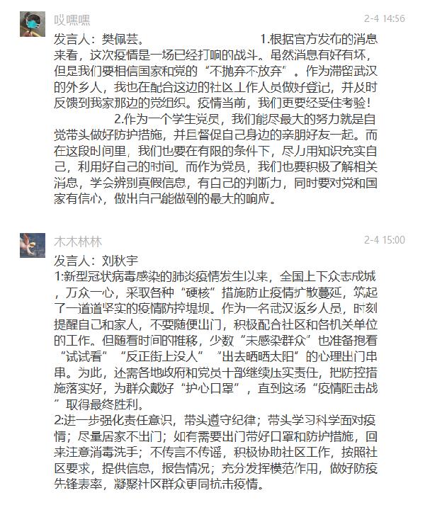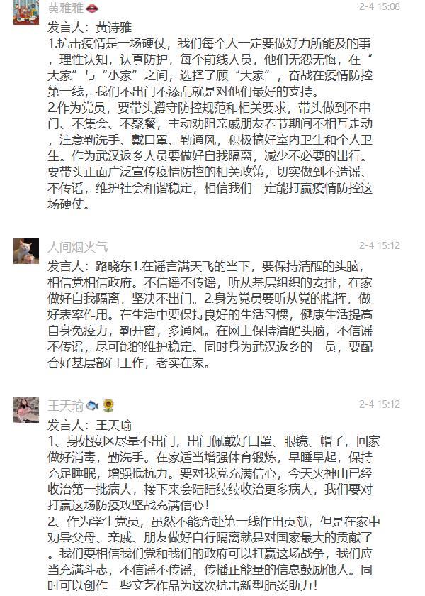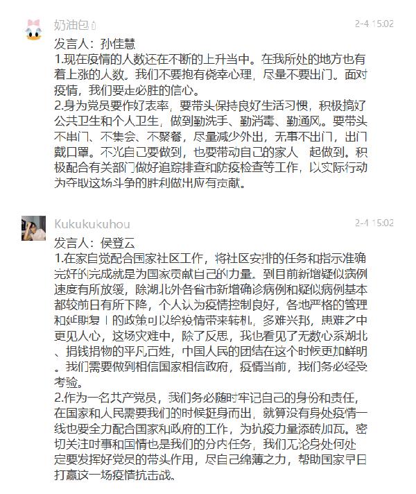 随后,支部党员围绕“共产党员要在防疫工作中发挥先锋模范作用”开展专题讨论,其中李家琪同志谈到人民网前几天发表评论,一线不需要口号,我们作为党员应少喊口号,多脚踏实地关注好自身力所能及可以做的事,积极了解疫情状况和预防措施,积极向长辈和身边的朋友普及预防方法。除此之外在家的这些时候也不能放下学习,时刻都不能松懈。而张婵同志则表示作为一名共产党员,我们不是专业人员,上不了前线,也可以凭一己之力跟家人和亲朋好友做好宣教工作,自觉隔离,做好防护,勤洗手,戴口罩,勤通风。在家学习模范党员的先进事例,用思想组装头脑,关键时刻祖国需要我们的时候,我们枕戈待旦。线上讨论气氛热烈,一句句都饱含支部党员众志成城、共克时艰的决心和信心。