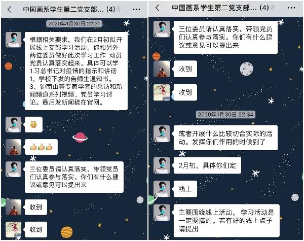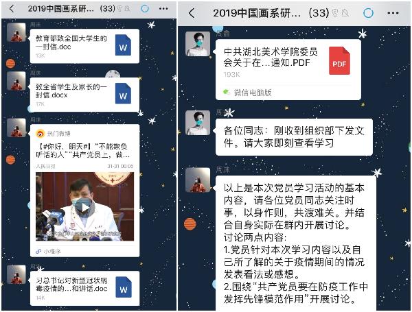 (通讯员:叶蕾)为了深入贯彻落实习近平总书记关于打赢疫情防控阻击战重要指示精神,根据湖北省委省政府、省教育厅和公司党委有关工作部署,进一步做好中国画系党总支疫情防控及宣传工作,落实好疫情防控期间不出门、不聚集的精神,我系员工第二党支部于2020年2月4日利用支部微信群开展了本月支部主题党日活动,号召广大研究生党员在疫情严防死守的关键时期发挥战斗堡垒和先锋模范作用,全体研究生党员参加了此次活动。