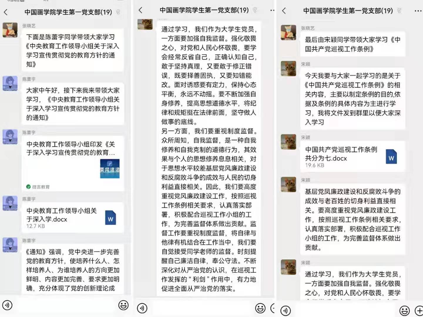 接近着,由王兆媚、冯谦、梅安琪、陈雨欣、王一喆、陈蕾宇、宋颖同志分别带领大家学习《论中国共产党历史》、《中国共产党简史》(第四章《夺取心新民主主义革命的全国性胜利》)、《毛泽东 邓小平 江泽民 胡锦涛关于中国共产党历史论述摘编》第四章《胡锦涛重要论述》、习近平总书记在庆祝中国共产党成立100周年大会上的重要讲话精神、《中央教育工作领导小组关于深入学习宣传贯彻党的教育方针的通知》和《中国共产党巡视工作条例》等文件资料。