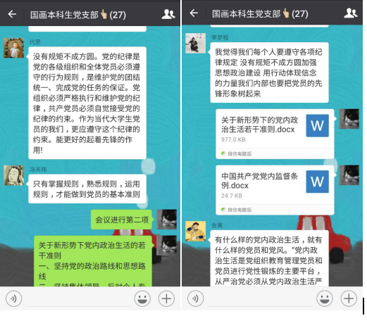 11月25日下午,中国画系本科生党支部全体成员在中国画本科生党员讨论组里展开了微信学习讨论会议,党员们围绕“讲奉献,有作为”这一主题展开了热烈的讨论。在会议上,大家学习了《中国共产党章程》、《关于新形势下党内政治生活的若干准则》、《中国共产党党内监督条例》以及《全省“两学一做”学习教育工作暨落实基层党建重点任务推进会》上的系列讲话精神,会议由本科生党支部副书记李佳津同志主持。