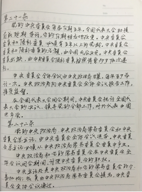 自“手抄党章”特色活动开展以来,全体员工党员积极参与,反响强烈。大家表示此项学习活动形式新颖,通过天天抄、天天写、天天记、天天悟,对党的纲领理解不断加深的同时,理想信念也进一步的得到了坚定,党性觉悟进一步提高。结合中国画系的专业特点,有的党员将手抄党章与练习书法相结合,大家以自己的一笔一划, 重温党章的一字一句,用抄写诵读来提升自己的党性修养和党纪意识,加深对党章的理解认识,进一步增强政治意识、大局意识,坚定理想信念,规范自身言行,切实做到始终忠诚于党、始终对组织坦诚、始终牢记政治责任。
