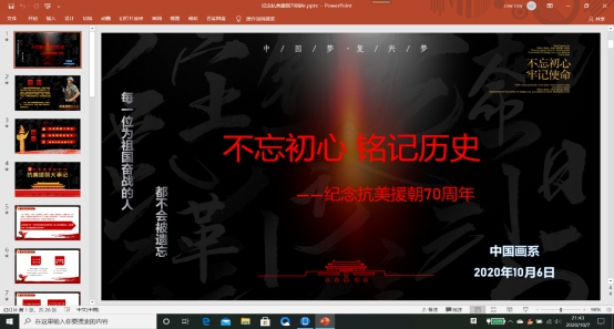 为做好中国画系“青马工程”培育,促进系部“活力团支部”建设,同时,正值中国人民志愿军抗美援朝70周年纪念,为引导广大团员员工回顾革命历史,瞻仰革命先烈,培育同学们的爱国主义精神。2020年10月6日至8日,中国画系辅导员曾艳老师和涂梦娟老师特组织本科生各年级员工开展“不忘初心,铭记历史”主题团日活动,以纪念抗美援朝70周年。